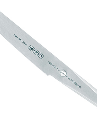 Chroma刀具系列-刀片採用高品質的日本301鋼,刀柄則由18/10不鏽鋼材質製成,透過焊接無縫結合,安全衛生無虞。鑄刀師傅使用三角鑽頭的特殊磨光技術,增強刀片的堅韌度,使鋒利的刀刃持久如新。