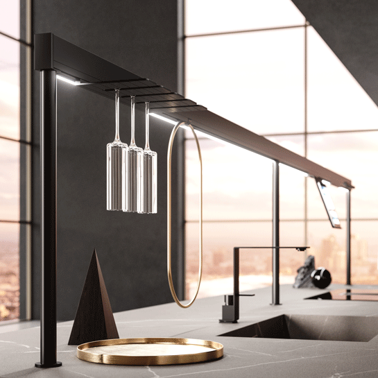 Elementi系列作品如Tibetus為品牌研發的橋型控制台,特色在於使用重量極輕的黑色陽極氧化鋁作為支架,支架既可安裝不同配件和廚房工具及杯具,同時也具備漫射燈的作用,簡約造型中蘊含充分的機能性。