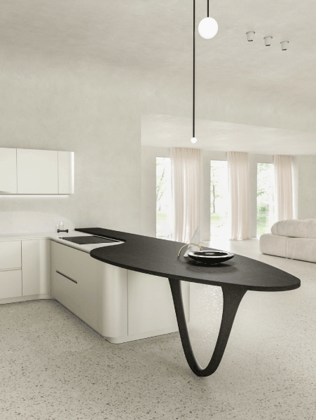 寬闊明亮白皙的空間內的中島廚房為目光焦點,對比的配色與異材質的結合,更能呈現OLA柔美圓滑的桌腳。