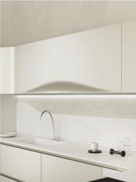 弧形吊櫃門板以特殊材質打造法拉利超跑的曲線,Snaidero義大利工匠手工噴漆打磨,打造出一體成形的圓滑線條,別緻而內斂。