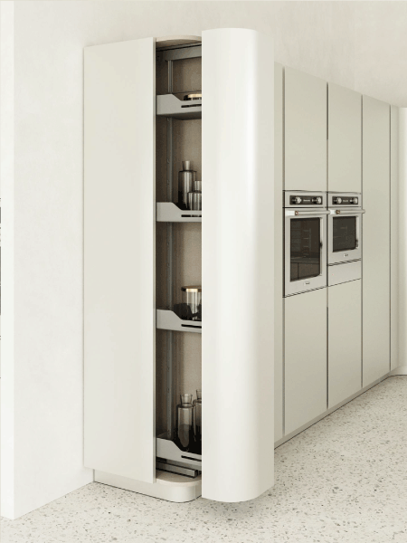 手感滑順的高櫃延續設計師無直角的設計理念,弧形線條型塑出流動的門板,去除掉櫃體的份量感也增加溫婉靜雅的氛圍。各式拉籃的組合系統兼顧了收納實用性與美觀設計感。