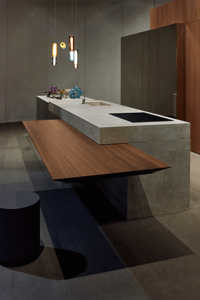 巨大的ELEMENTI中島映入眼簾,側板上的水平槽線既能隱藏側板和頂部之間的接縫,也營造出俐落的線條感,邊緣30度角斜切入的溫暖木質吧台,中和石材帶來的冷冽感,檯面180x60 cm承重580公斤。