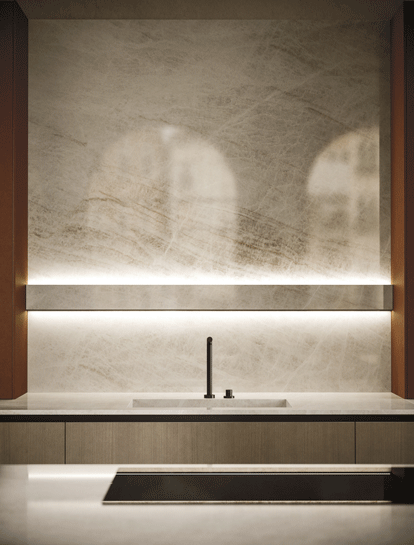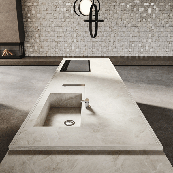 2024年的ELEMENTI系列,在中島檯面邊緣的處理上,都運用了砌塊設計。這項技術不僅展現了精湛的工藝,還可以防止水槽過滿外溢。可選擇的材質包括石材、岩板和大理石。