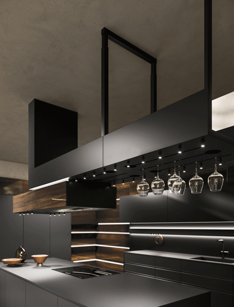 全新Domina系統的引入,代表著JOY系列邁出了革命性的一步。創新的Domina系統打造了新穎時尚且功能性強大的收納架,懸掛在天花板上的結構不僅提供功能性和美觀的空間,還為抽油煙機的選擇提供了前所未有的自由度。收納架上方配有高腳杯支架和可調節的微型射燈,將廚房打造成社交場所,可自由轉換生活情境。Domina系統的材質可依照廚房門板材質進行客製化搭配。