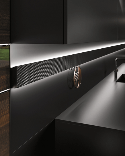 Velo燈帶將照明設計提升至藝術境界,在2024年米蘭設計週的WAY和JOY系列吸引了大量人潮。在JOY系列2024的全新設計中,Velo燈帶的幾何反射效果,結合了黑鑽石定制門板,再加上間接照明,為廚房空間增添了藝術風采。此外,也可掛上酒杯支架及iPad支架配件,既實用且美觀。這種極具美學影響力的元素,展現未來廚房的生活樣貌,讓廚房不只是烹飪場所,也能是社交展演空間。
