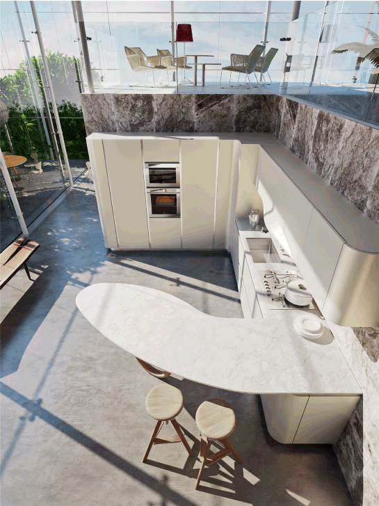 廚房逐漸取代客廳成為現代人家中的重心,而社交型的中島廚房則是常辦聚會者的首選,也逐漸成為豪宅廚房設計的趨勢。若想打造一套絕美有個性的社交型中島廚房,建議使用曲線檯面加大吧檯的使用空間,圓潤的輪廓搭配廚房邊緣的圓角,讓設計風格呈現一體性,既時尚又使一進門的客人印象深刻。例如這套義大利時尚廚具品牌Snaidero與法拉利設計師合作的OLA系列,以法拉利跑車為概念,風格典雅俐落,弧形桌腳採用頂級跑車使用的碳纖材質製成,曲線亮眼迷人,整套廚房找不到任一直角,流暢造型令人驚豔。