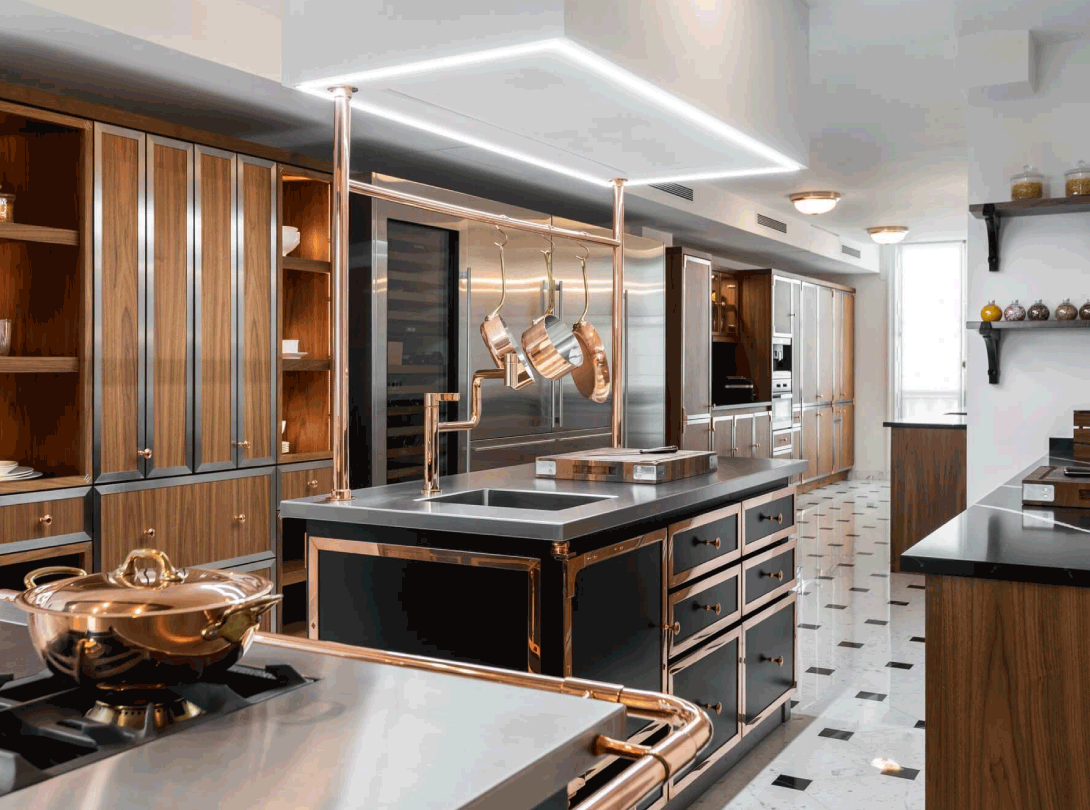 令人驚嘆的La Cornue訂製廚具Château城堡系列也被安裝於宅邸中,雙中島分別為輕食預備區與安裝大型爐連烤的重烹調區。黑色面板搭配異材質的玫瑰銅飾面與深木櫃櫃,展現此座奢華宅邸的古典氣息。