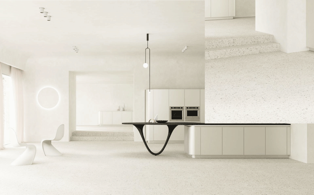 寬闊明亮白皙的空間內的中島廚房為目光焦點,對比的配色與異材質的結合,更能呈現OLA柔美圓滑的桌腳。