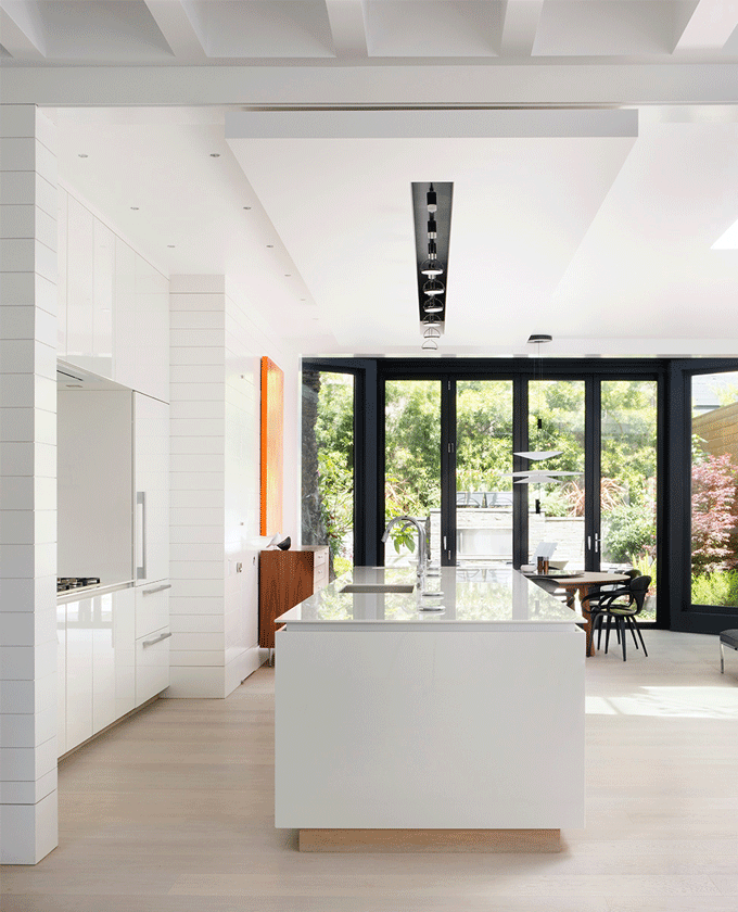 在大型中島廚房和用餐區後面,人們的目光總是被花園吸引,一面亮橙色的畫作令人印象深刻地掛在側壁上。 -
