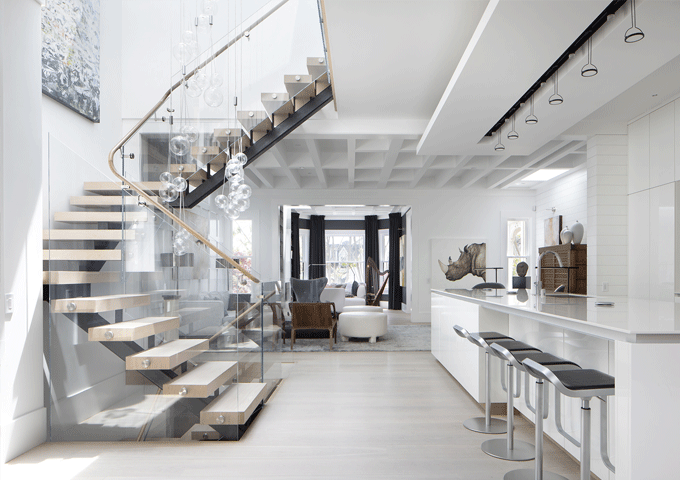 開放的樓梯動態地蜿蜒穿過四層樓,在主要的生活空間中,一眼可以看見整個房子的深度,雙翼門從用餐區通向花園,和房子其他部分一樣,配色以白色為主,佐以深色和黑色元素,以及淺木色,形成平衡的對比,而藝術品則帶來動感和色彩繽紛的裝飾。