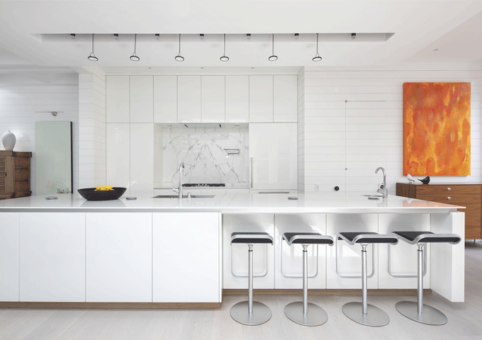 Poggenpohl +SEGMENTO 廚房是一樓開放式客廳的亮點。 優雅且極具線條感的風格,連接客廳和用餐區。 廚房位於一樓的中央,無法忽視且充滿活力的+SEGMENTO,採用極地白色的高光飾面,與明亮的室內裝潢無縫融合。 設計過程耗時一年多,直到最近,室內設計師 Ric Pulley 和 Poggenpohl 的廚房規劃師仍在研究細節。 帶有兩個大水槽的長檯面線性且齊平,廚房中島的座位區邀請客人逗留片刻,或坐下來欣賞接下來的餐點。在它後面的則是落地櫥櫃構成的大理石烹飪區。 一個巧妙的技巧強化了乾淨的整體形象:廚房用具隱藏在櫥櫃門後面。 -