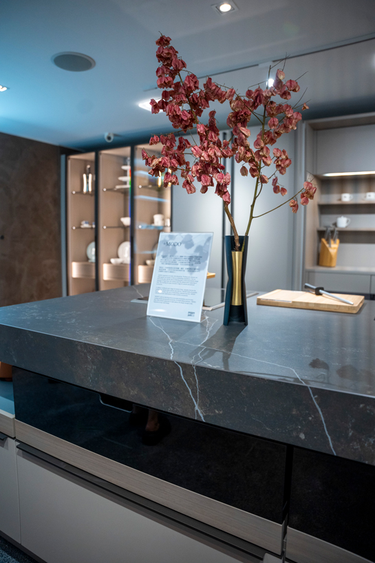 今年於德國新亮相的+SEGMENTO曲面中島,也在台中惠中門市首次亮相,數十條細膩的倒角線條勾繪柔美曲面,也形成了吧台座位區。背部以反差的深色櫥櫃烘托高雅的現代風格,無把手的設計也呈現+SEGMENTO經典的俐落外型。