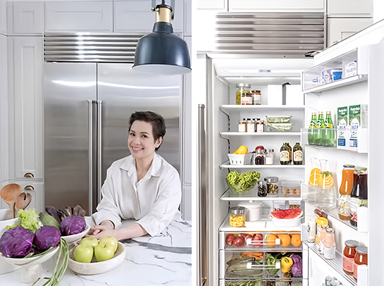 對食物的講究,讓她對Sub-Zero冰箱的效能十分滿意,因為它精準的溫控,以及獨家的濕度控制專利,讓冰箱具備更強效的保鮮能力,雙壓縮機與雙獨立系統,讓食物不混味,創造了理想的儲藏環境,此外,它還配備了NASA空氣淨化系統,具殺菌與消除乙烯功能,保鮮抽屜與熟食抽屜形成一個非常適合蔬果與肉類保存的低溫空間。
